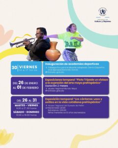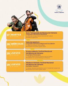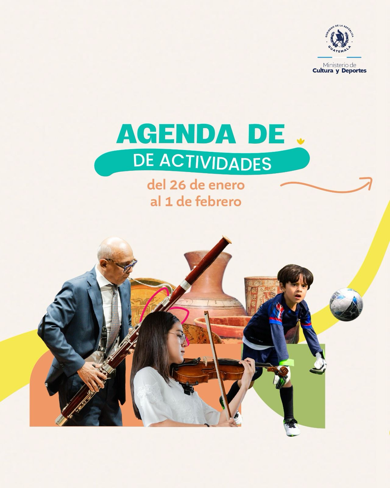 Una semana llena de arte, cultura y deporte. Te compartimos la Agenda Cultural de la semana, dónde podrás participar de diferentes actividades en compañía de familia, amigos o con quién tú quieras . <img class="alignnone size-medium wp-image-71147" src="https://guatemala.gob.gt/wp-content/uploads/2026/01/WhatsApp-Image-2026-01-26-at-09.21.45-240x300.jpeg" alt="" width="240" height="300" /><img class="alignnone size-medium wp-image-71144" src="https://guatemala.gob.gt/wp-content/uploads/2026/01/WhatsApp-Image-2026-01-26-at-09.21.48-240x300.jpeg" alt="" width="240" height="300" /> <img class="alignnone size-medium wp-image-71145" src="https://guatemala.gob.gt/wp-content/uploads/2026/01/WhatsApp-Image-2026-01-26-at-09.21.47-240x300.jpeg" alt="" width="240" height="300" /><img class="alignnone size-medium wp-image-71146" src="https://guatemala.gob.gt/wp-content/uploads/2026/01/WhatsApp-Image-2026-01-26-at-09.21.46-240x300.jpeg" alt="" width="240" height="300" />