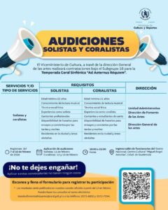 El Viceministerio de Cultura, a través de la Dirección General de las Artes te invita a participar en las audiciones para solistas y coralistas. Si amas el canto y tienes formación vocal, esta es tu oportunidad de crecer y compartir tu talento en una producción única.