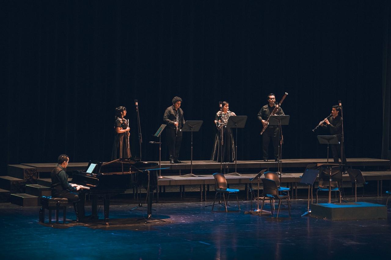 Durante la primera parte del concierto se presentó el Quinteto Xocomil, agrupación de vientos integrada por la flautista Rubí Escobar, la cornista Ángela Jayes, el clarinetista Ben Levi Girón, el fagotista Marlon Chacón y el oboísta Joaquín Paniagua. A estos talentosos músicos se sumó el maestro Junior Medina, recientemente incorporado a las instituciones artísticas de la Dirección de Fomento de las Artes como pianista.