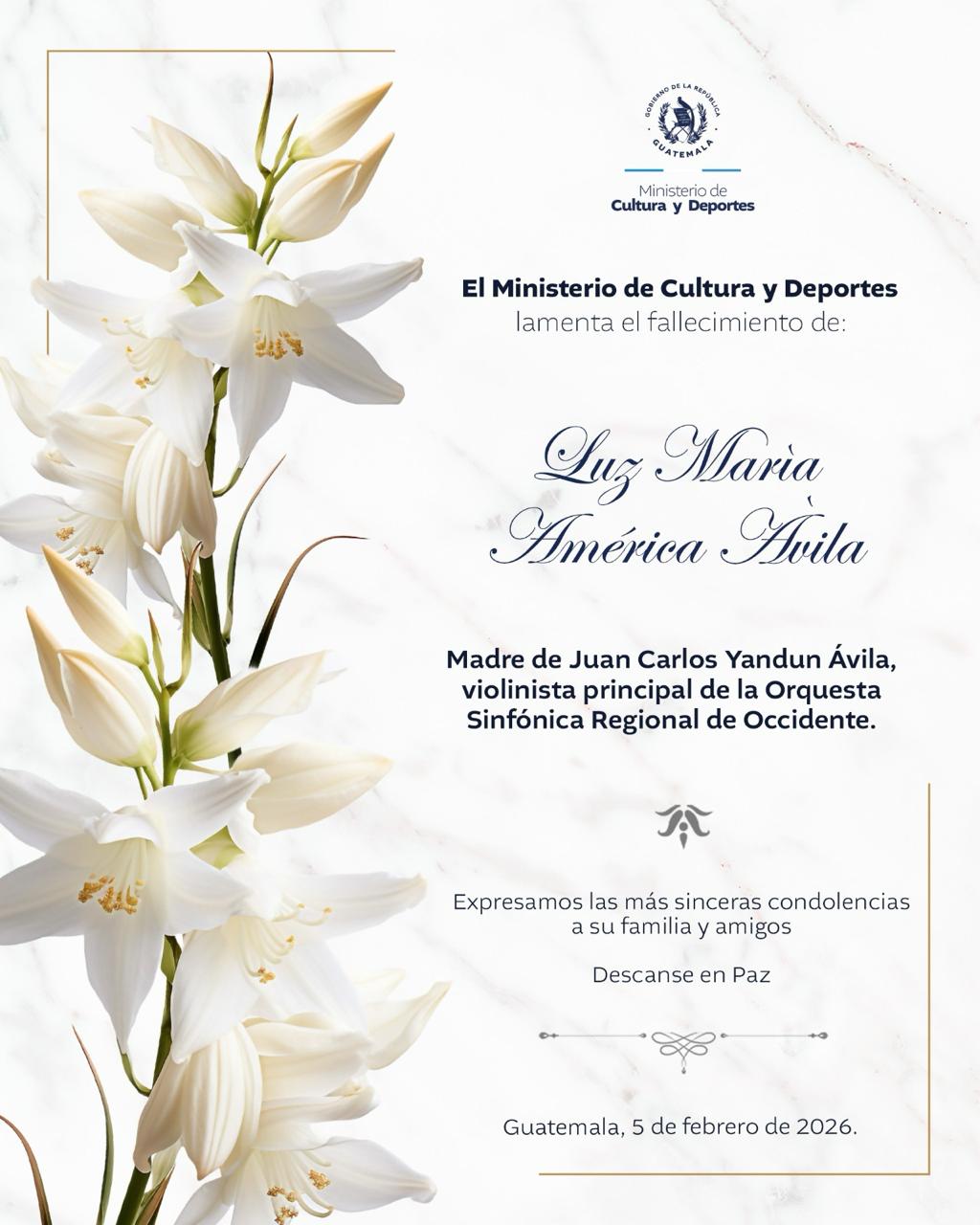 Lamentamos profundamente el sensible fallecimiento de Luz María América Ávila, madre de Juan Carlos Yandun Ávila, violinista principal de la Orquesta Sinfónica Regional de Occidente.