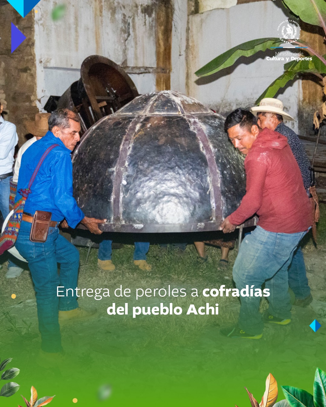 En un encuentro de diálogo entre representantes del Viceministerio de Patrimonio Cultural y Natural y cofradías de Rabinal, Baja Verapaz, se realizó la entrega de cinco peroles a cofradías del pueblo Achi, entre ellas: Virgen del Rosario, San Pablo Apóstol, Natividad de María, San Pedro Mártir y San Sebastián. Estas herramientas son esenciales para la preparación de los tradicionales tamales guatemaltecos.