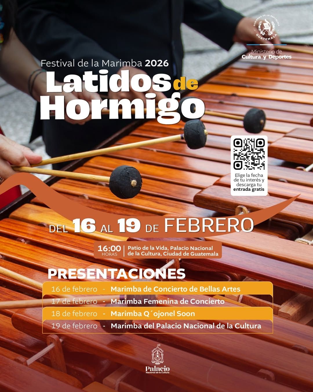 Disfruta de los “Latidos de Hormigo” que trae el Festival de Marimba 2026. Cuatro conciertos y cuatro conjuntos artísticos preparan el camino para la gran celebración de nuestro instrumento nacional este 20 de febrero.