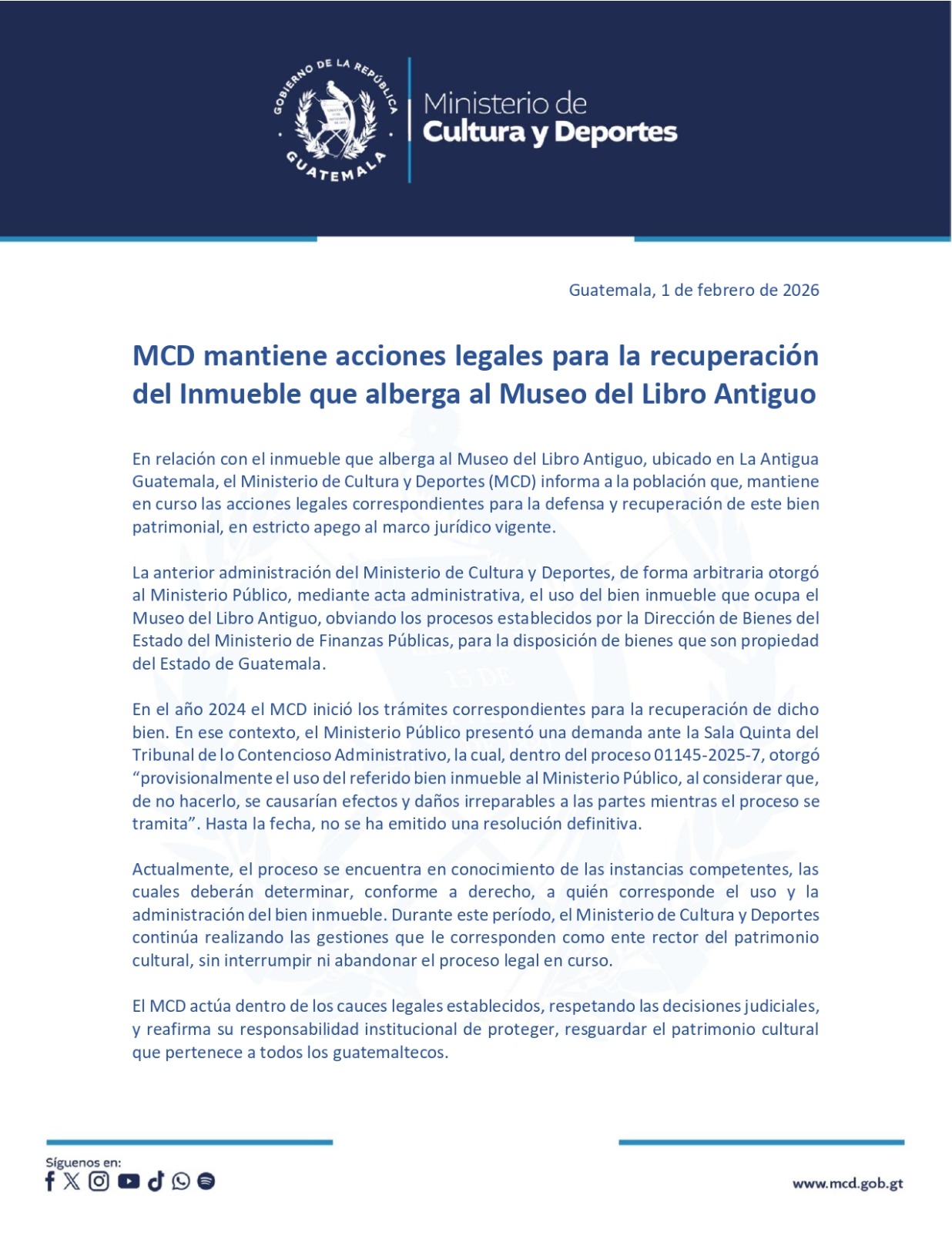 En relación con el inmueble que alberga al Museo del Libro Antiguo, ubicado en La Antigua Guatemala, el Ministerio de Cultura y Deportes (MCD) informa a la población que, mantiene en curso las acciones legales correspondientes para la defensa y recuperación de este bien patrimonial, en estricto apego al marco jurídico vigente.