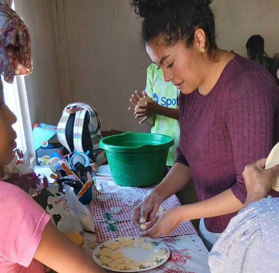 Personal del Sistema Nacional de Extensión Rural instruyó a las participantes en el uso correcto de utensilios como tazas medidoras y moldes, enfatizando la importancia de la inocuidad mediante el uso de redes para el cabello y estrictas normas de higiene durante el proceso de machacado de la mezcla.