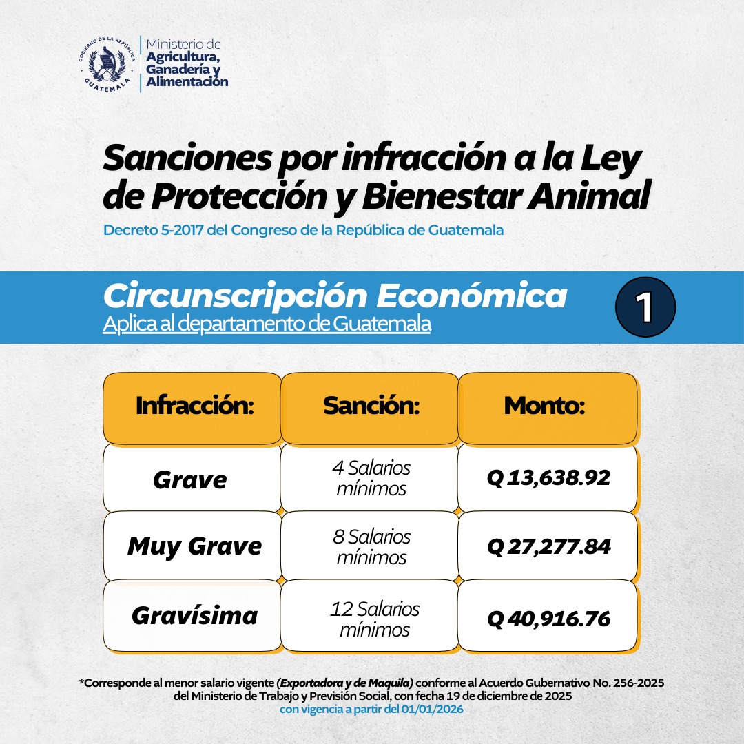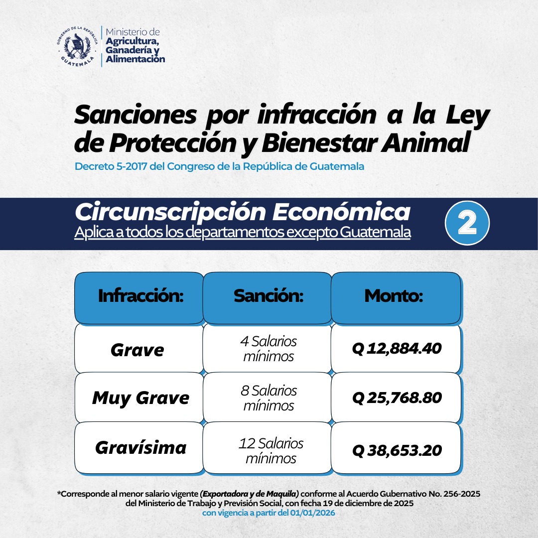 La Ley de Protección y Bienestar Animal, establecida por el Decreto 5-2017 del Congreso de la República, contempla sanciones económicas para las personas que incurran en actos de maltrato, crueldad o negligencia hacia los animales.