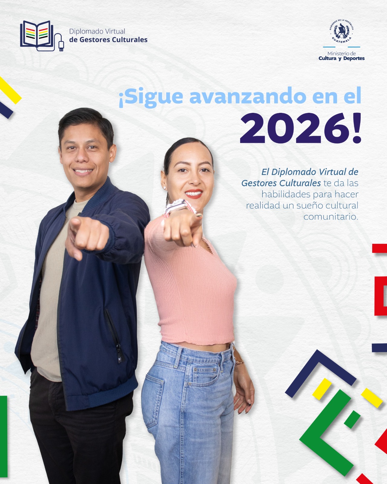 Sigue progresando en tus lecciones y no olvides que el diplomado te permite adquirir y fortalecer tus capacidades para la promoción del arte, la cultura y el desarrollo comunitario en Guatemala.